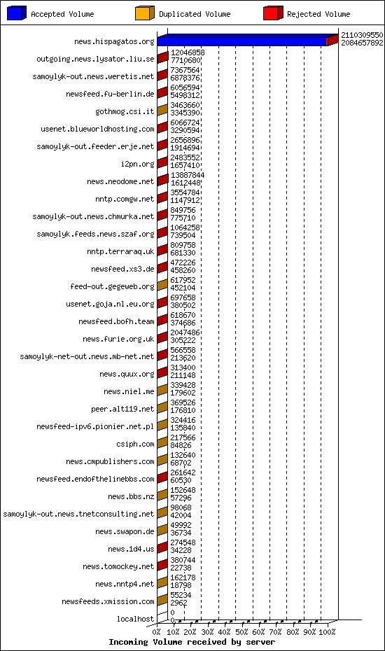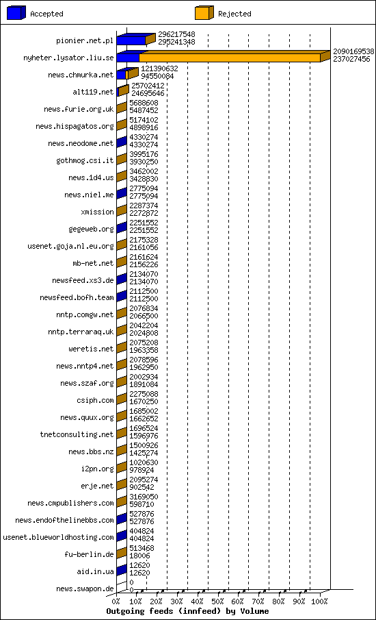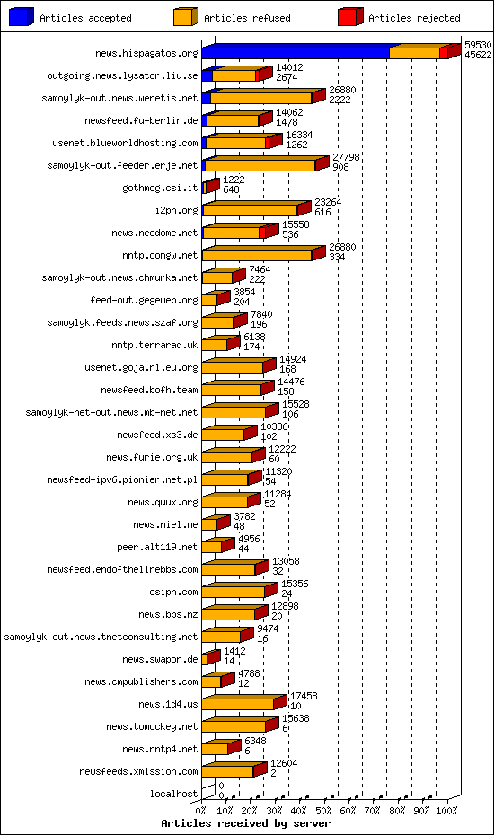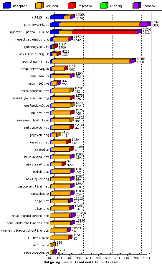 | 2 | outgoing.news.lysator.liu.se | 2 | 14012 | 2674 | 10532 | 806 | 19% | 47:59:56 |