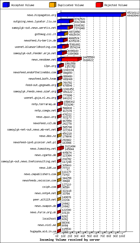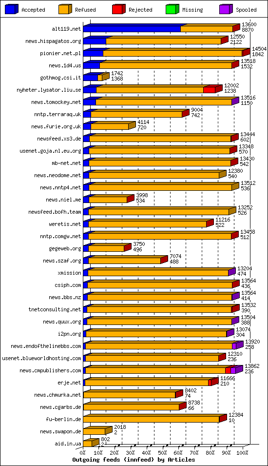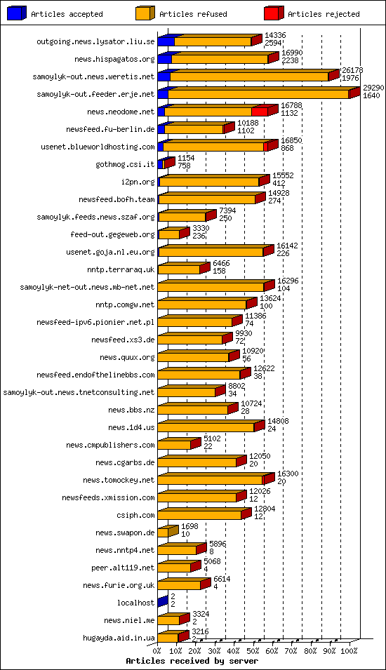 | 13 | usenet.goja.nl.eu.org | 20 | 16142 | 226 | 15880 | 36 | 1% | 48:01:20 |