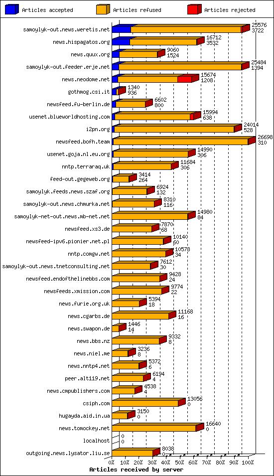 | 11 | usenet.goja.nl.eu.org | 22 | 14990 | 306 | 14624 | 60 | 2% | 48:39:24 |