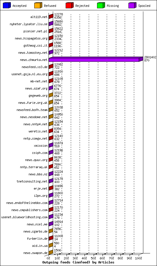| 12 | nntp.terraraq.uk | 4 | 11684 | 306 | 11336 | 42 | 2% | 72:54:50 |