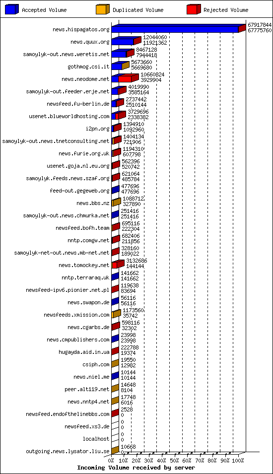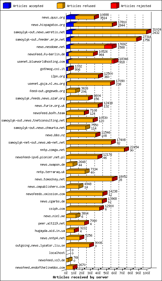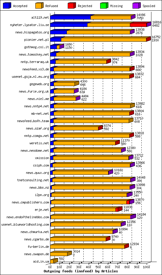 | 10 | usenet.goja.nl.eu.org | 20 | 17090 | 238 | 16836 | 16 | 1% | 48:04:16 |