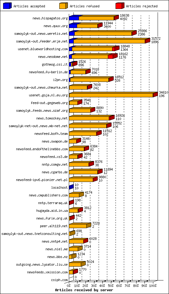 | 20 | nntp.comgw.net | 6 | 8376 | 38 | 8098 | 240 | 0% | 22:56:26 |