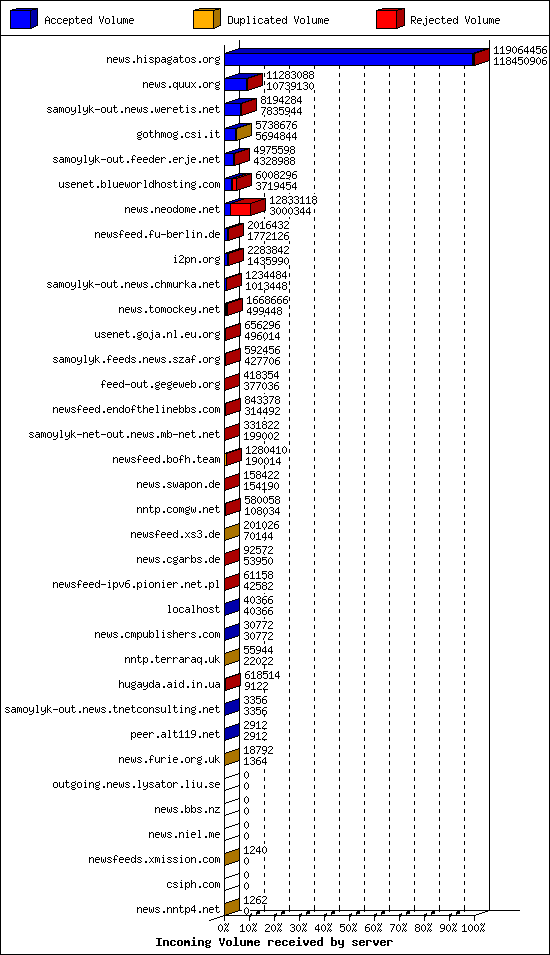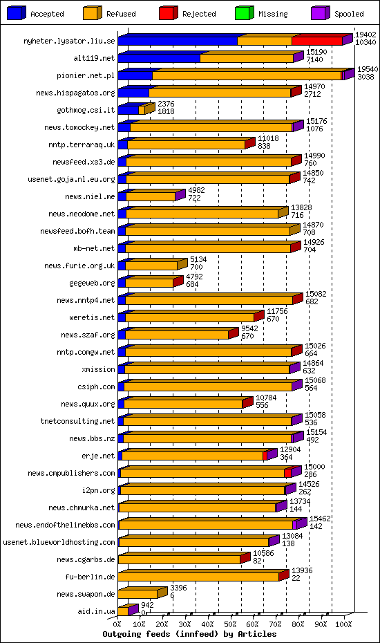 | 5 | usenet.blueworldhosting.com | 1438 | 18848 | 1364 | 16566 | 918 | 7% | 46:26:00 |