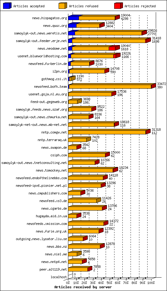 | 16 | nntp.comgw.net | 4 | 31318 | 112 | 31106 | 100 | 0% | 81:28:38 |