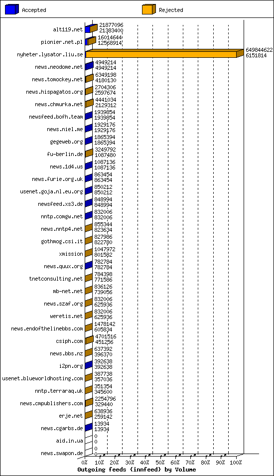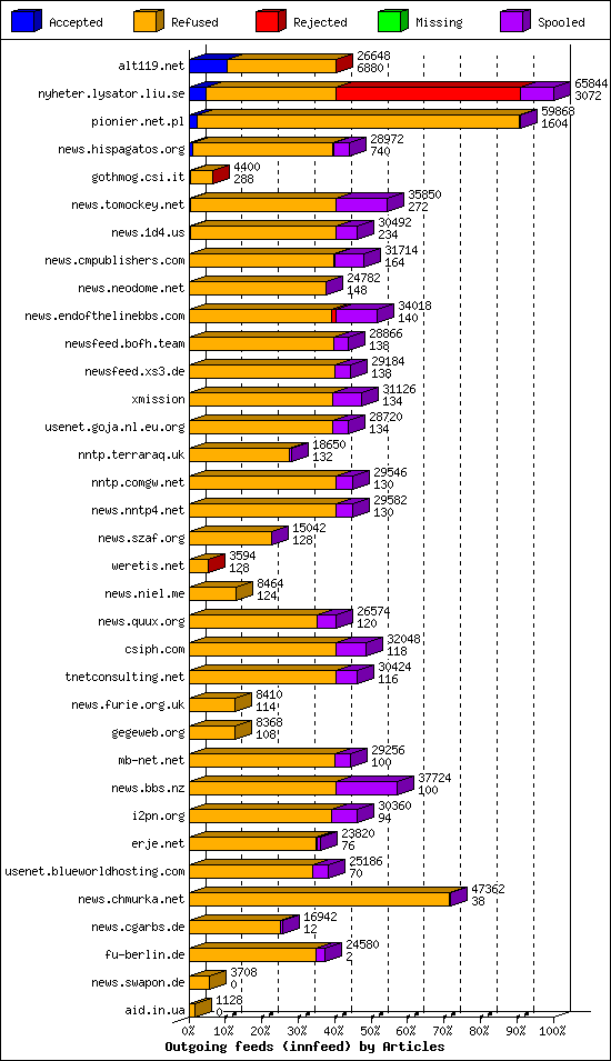 | 12 | outgoing.news.lysator.liu.se | 10 | 27296 | 100 | 25998 | 1198 | 0% | 17:39:30 |