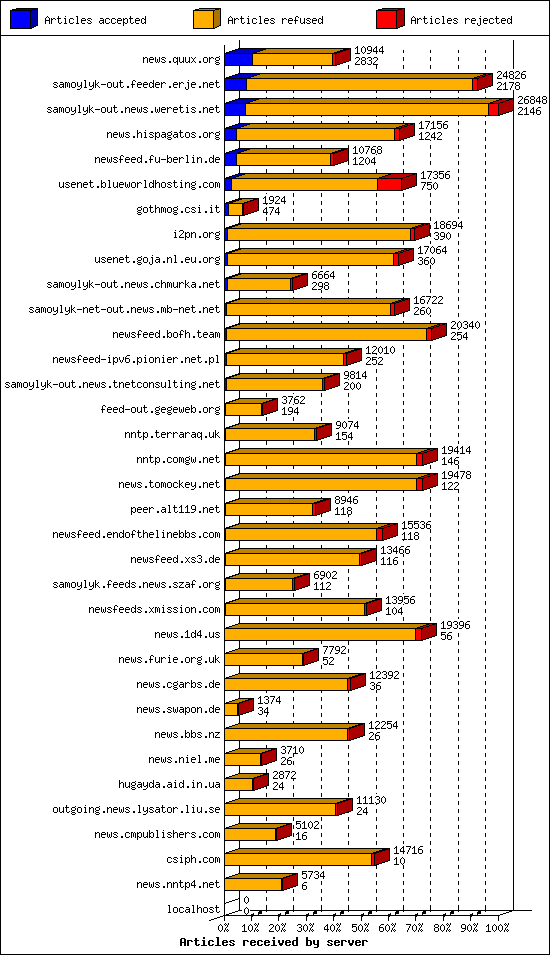 | 6 | usenet.blueworldhosting.com | 1420 | 17356 | 750 | 14314 | 2292 | 4% | 47:12:12 |