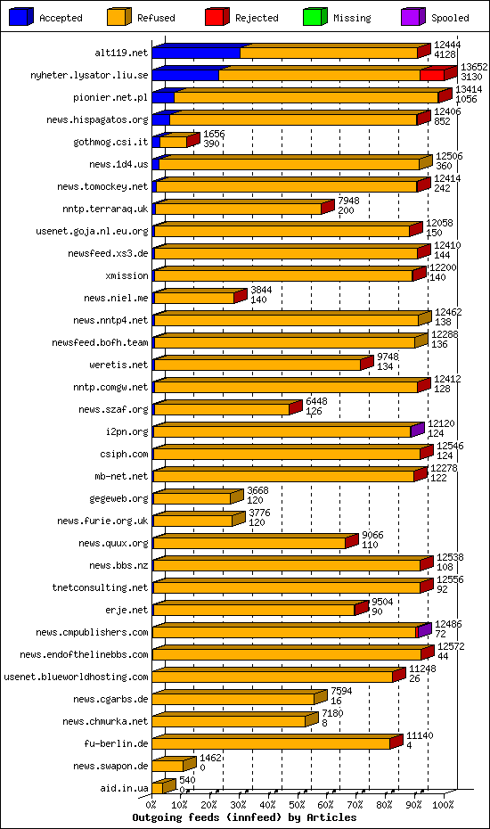 | 16 | nntp.terraraq.uk | 4 | 9074 | 154 | 8746 | 174 | 1% | 58:01:16 |