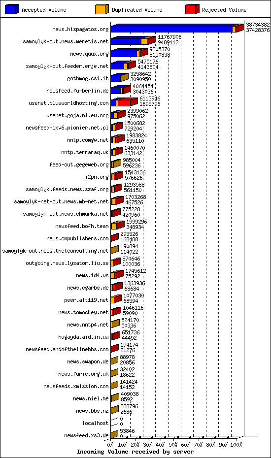 | 7 | usenet.blueworldhosting.com | 1426 | 16072 | 602 | 13730 | 1740 | 3% | 47:37:32 |