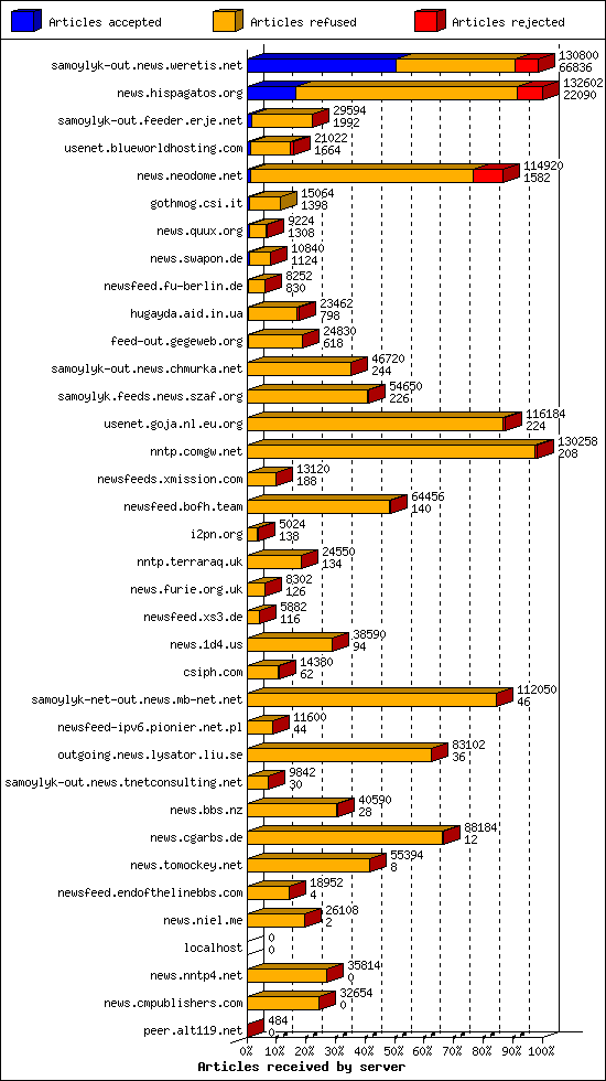 | 15 | nntp.comgw.net | 10 | 130258 | 208 | 129100 | 950 | 0% | 95:41:24 |