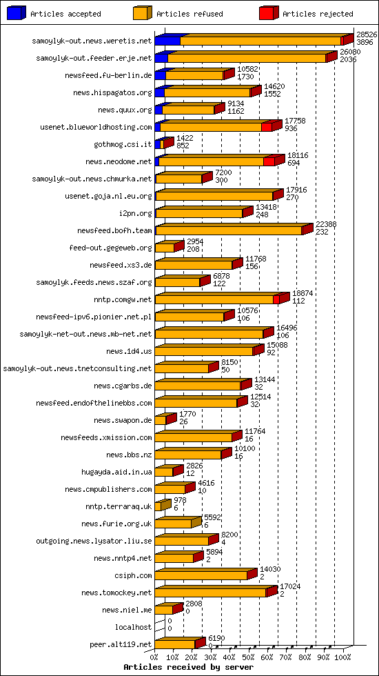 | 6 | usenet.blueworldhosting.com | 1568 | 17758 | 936 | 15236 | 1586 | 5% | 47:29:28 |