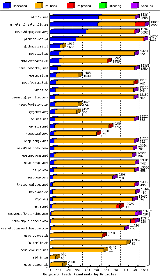 | 12 | usenet.goja.nl.eu.org | 24 | 16116 | 166 | 15938 | 12 | 1% | 47:21:12 |