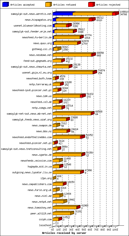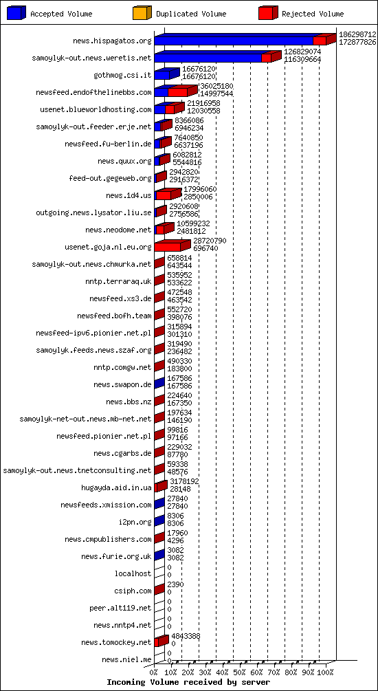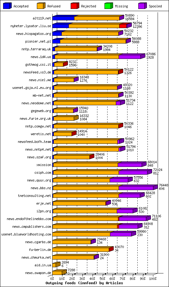 | 3 | usenet.blueworldhosting.com | 1660 | 26986 | 3392 | 20306 | 3288 | 12% | 62:36:38 |