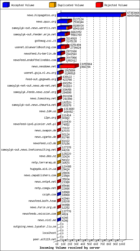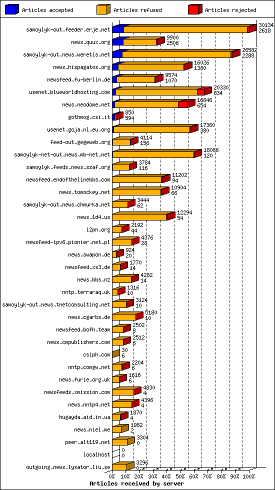 | 6 | usenet.blueworldhosting.com | 1312 | 20330 | 834 | 17884 | 1612 | 4% | 46:41:30 |