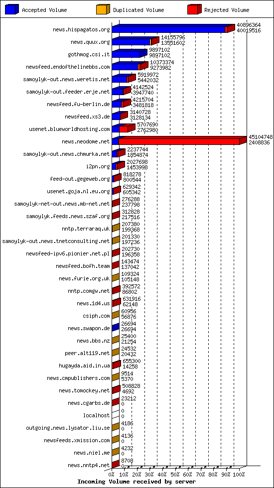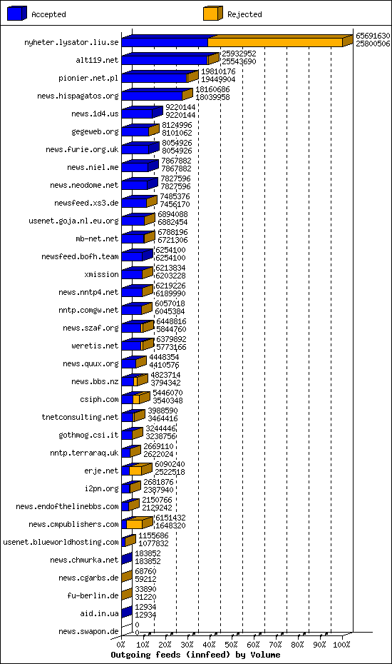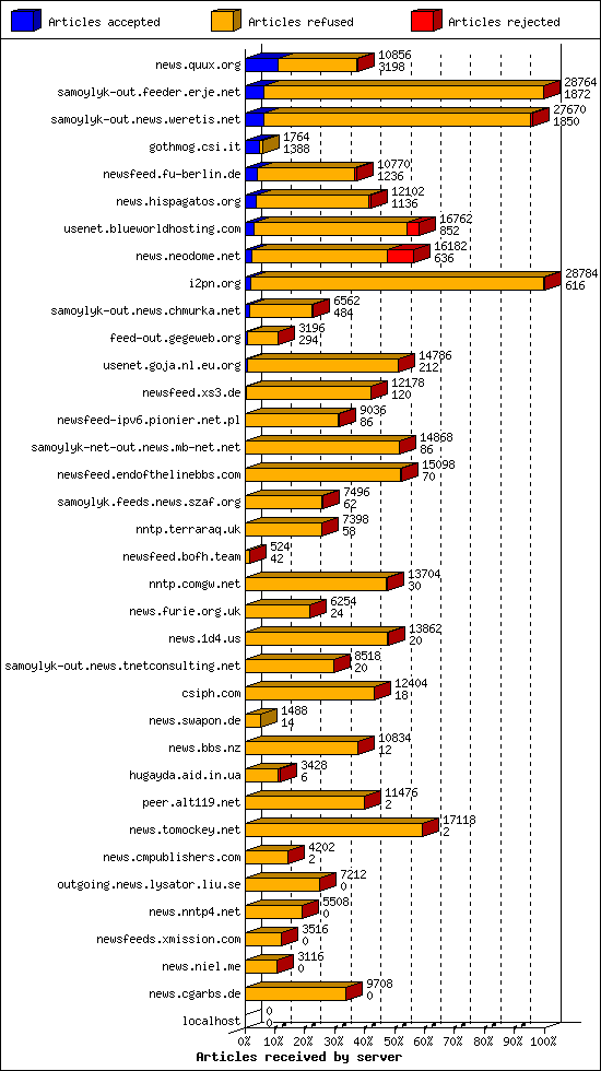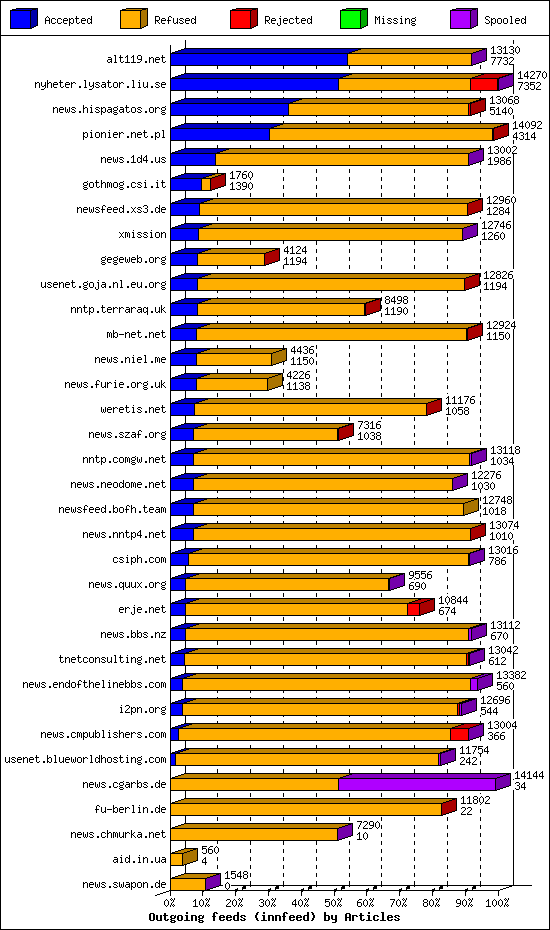 | 12 | usenet.goja.nl.eu.org | 20 | 14786 | 212 | 14566 | 8 | 1% | 48:08:42 |