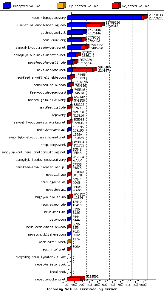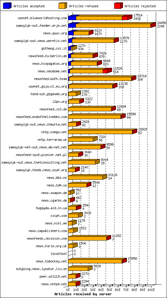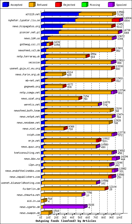 | 10 | usenet.goja.nl.eu.org | 26 | 13138 | 208 | 12896 | 34 | 1% | 39:06:22 |