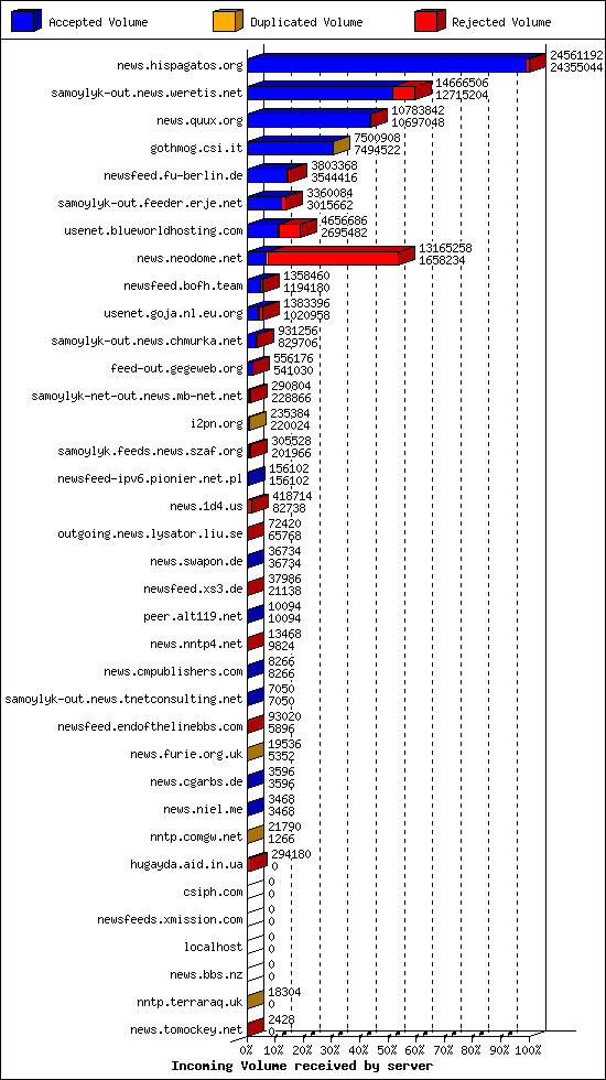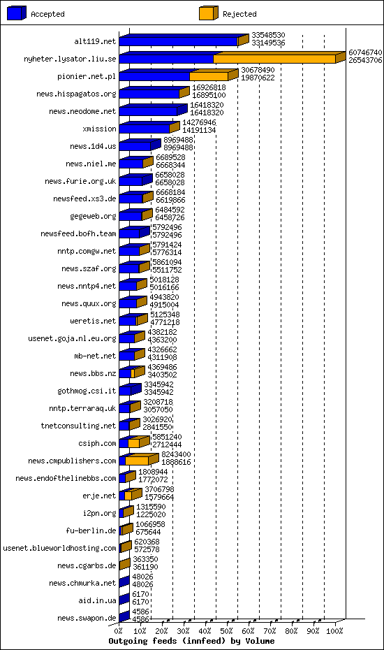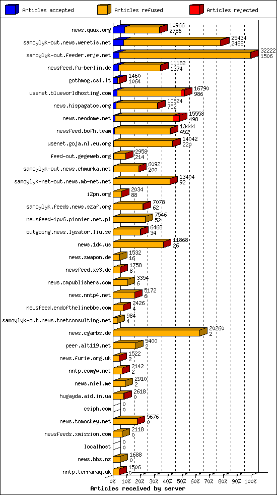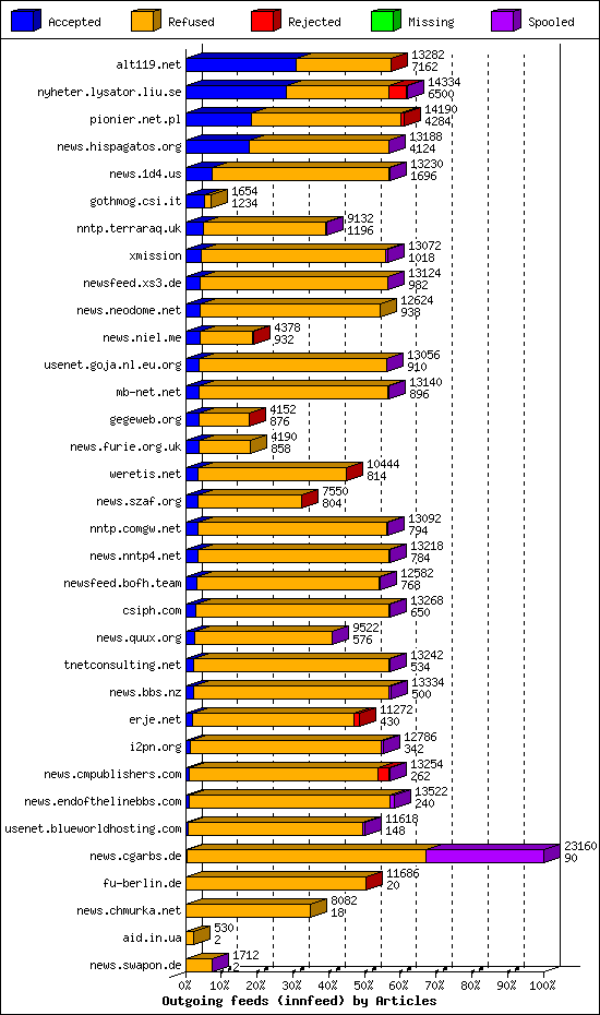 | 17 | outgoing.news.lysator.liu.se | 4 | 6468 | 34 | 6430 | 4 | 0% | 36:16:38 |