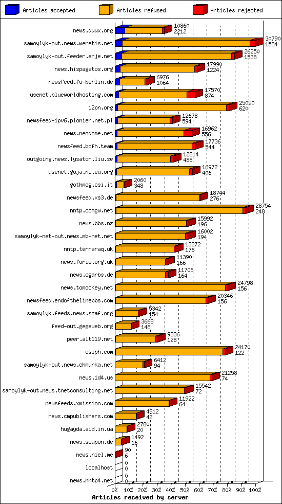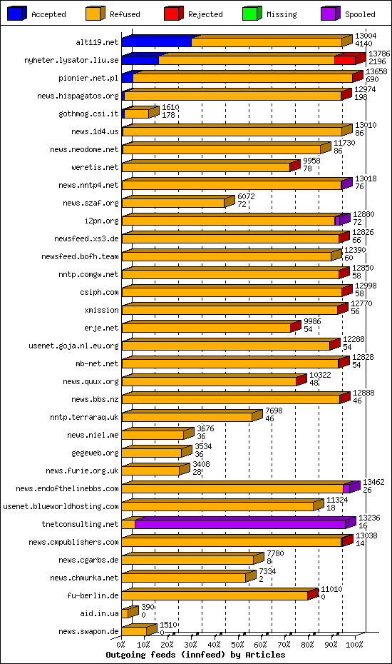 | 12 | usenet.goja.nl.eu.org | 20 | 16972 | 406 | 15946 | 620 | 2% | 47:37:28 |