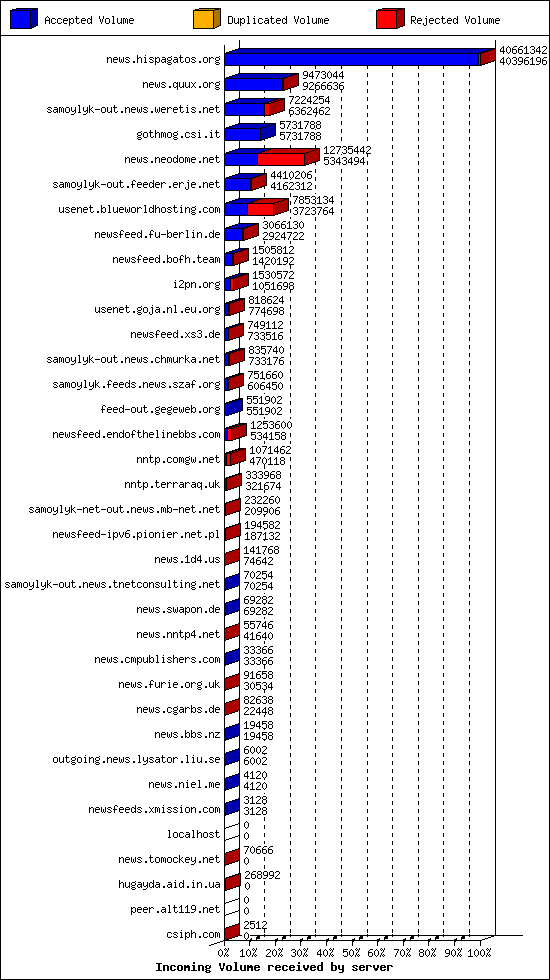 | 6 | usenet.blueworldhosting.com | 824 | 17864 | 1278 | 14910 | 1676 | 7% | 47:33:16 |