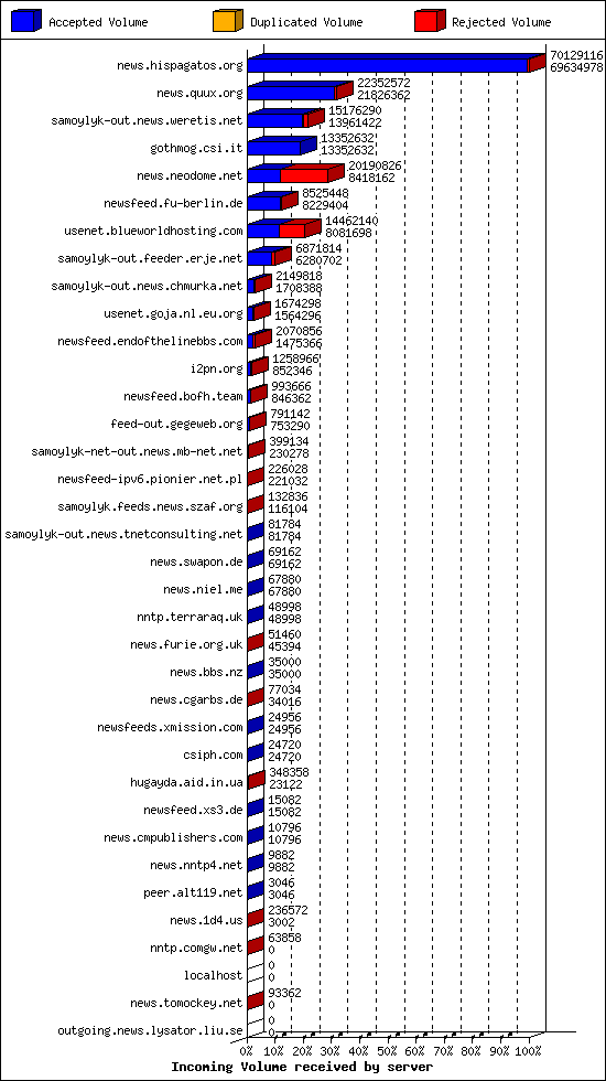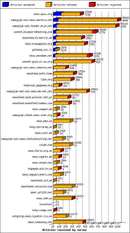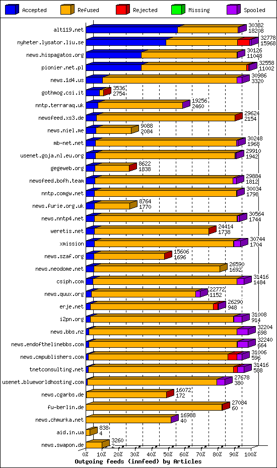| 9 | usenet.goja.nl.eu.org | 40 | 33278 | 514 | 32728 | 36 | 1% | 82:29:08 |