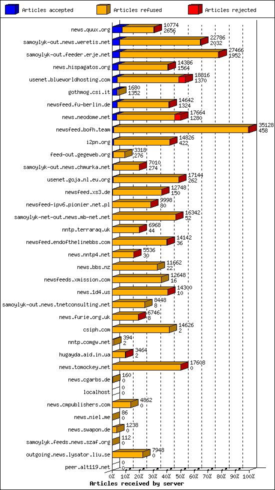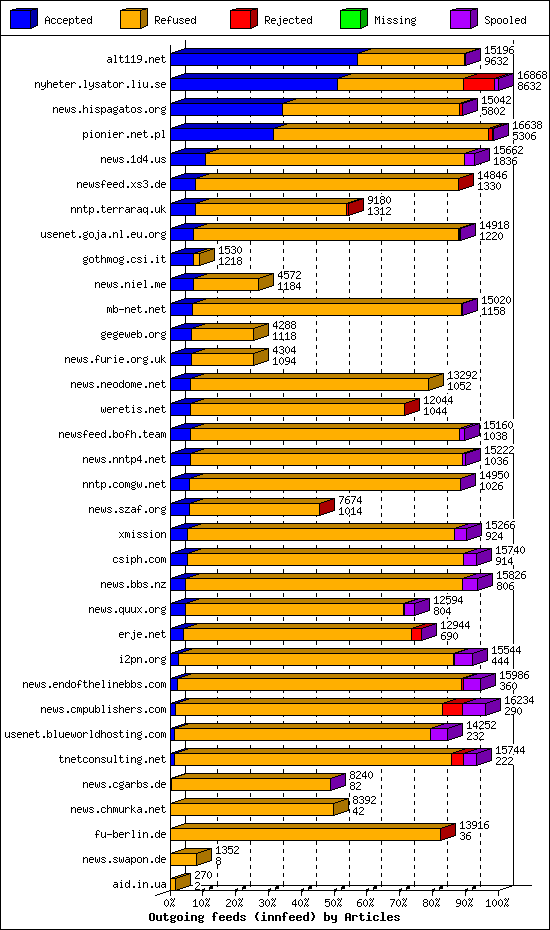 | 13 | usenet.goja.nl.eu.org | 22 | 17144 | 262 | 16856 | 26 | 1% | 47:19:54 |