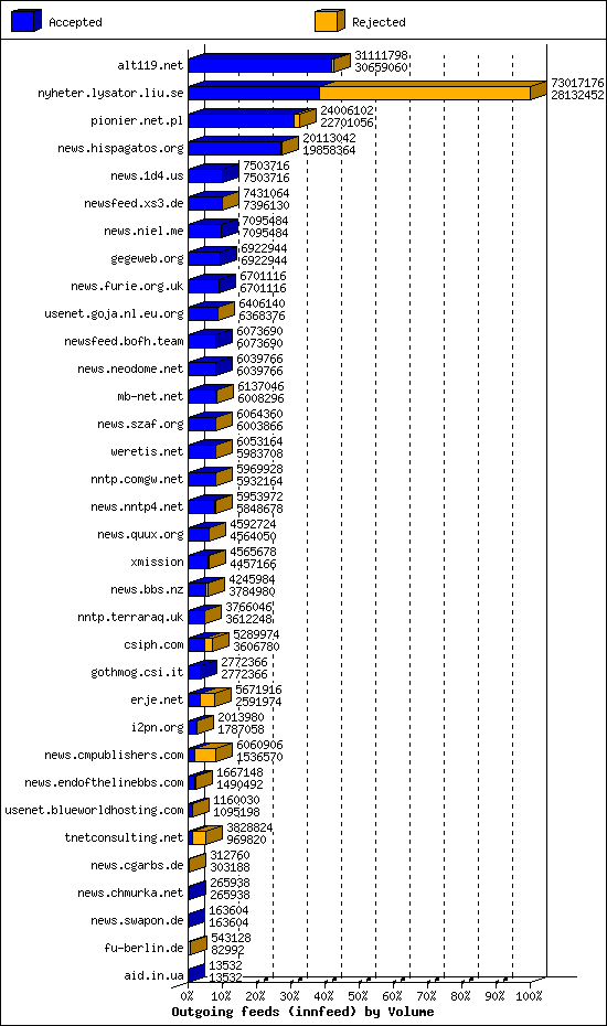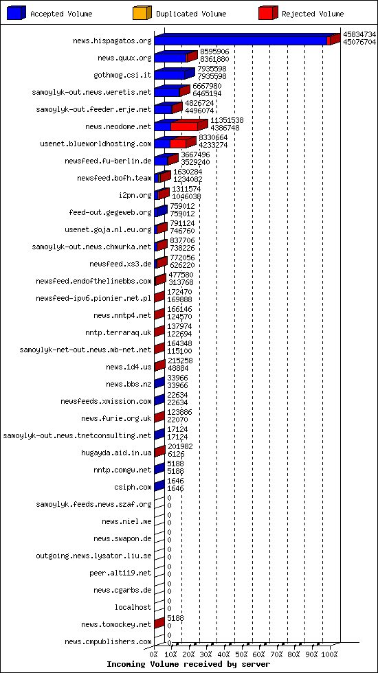 | 5 | usenet.blueworldhosting.com | 576 | 18816 | 1370 | 15766 | 1680 | 7% | 46:58:34 |