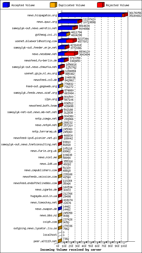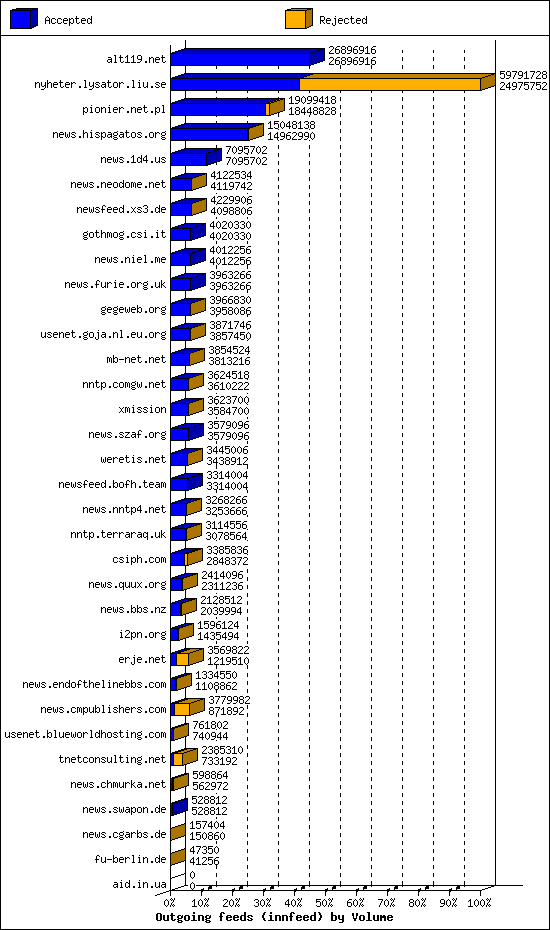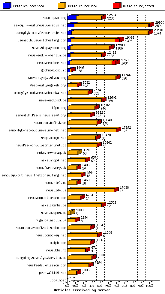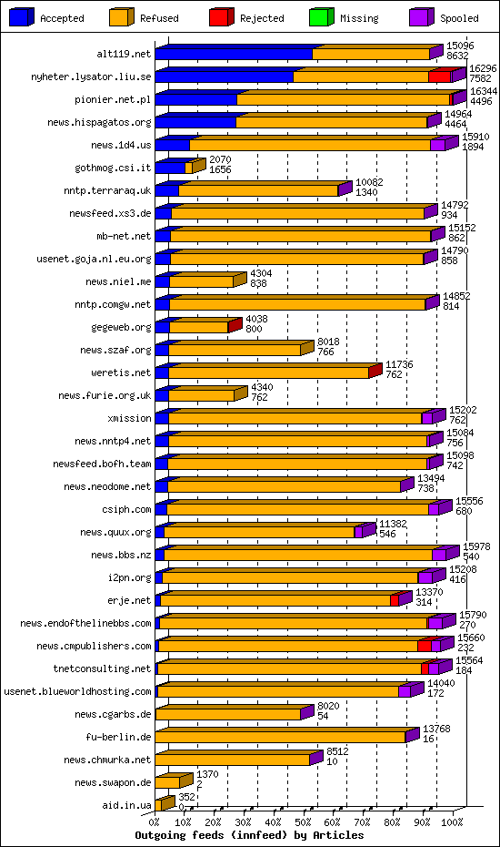 | 9 | usenet.goja.nl.eu.org | 22 | 17744 | 328 | 17302 | 114 | 1% | 44:43:22 |