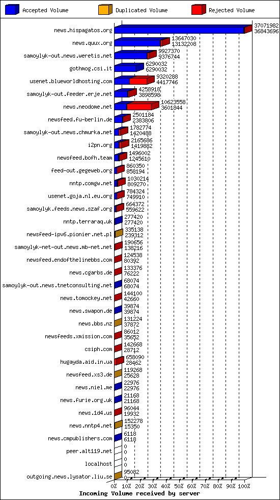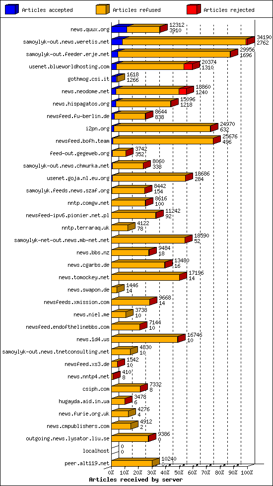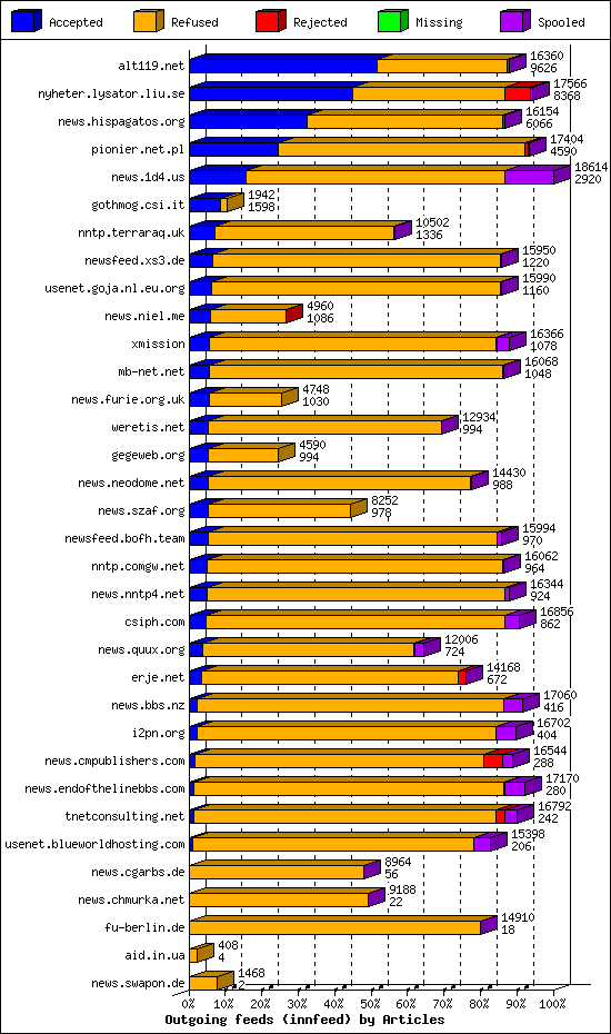 | 13 | usenet.goja.nl.eu.org | 24 | 18686 | 284 | 18386 | 16 | 1% | 47:59:20 |