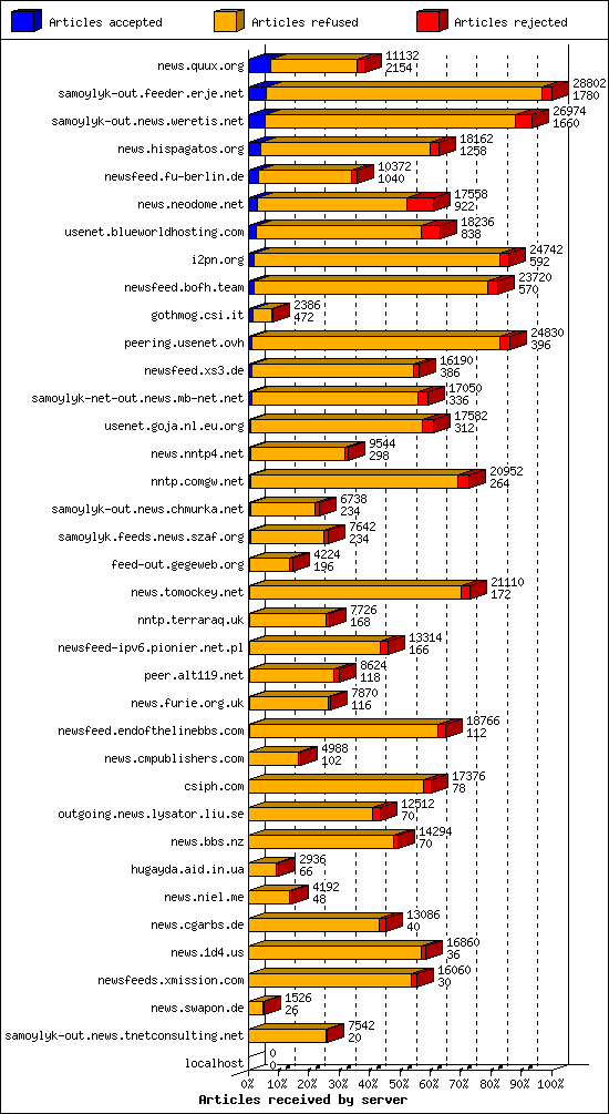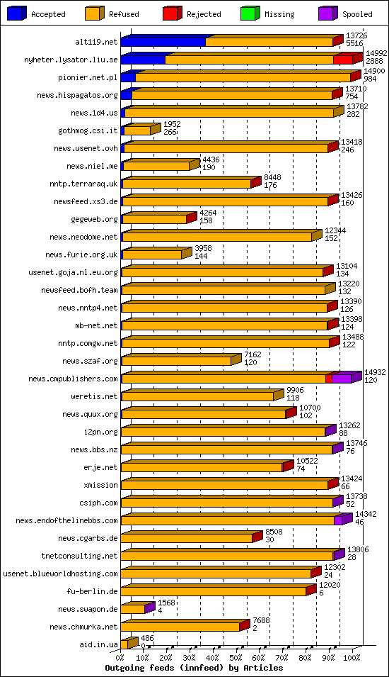 | 14 | usenet.goja.nl.eu.org | 22 | 17582 | 312 | 16272 | 998 | 1% | 48:02:20 |