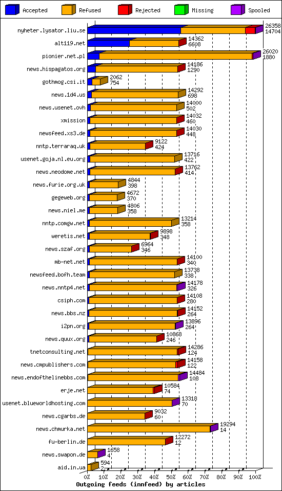 | 14 | newsfeed-ipv6.pionier.net.pl | 10 | 13136 | 392 | 12080 | 664 | 2% | 49:24:42 |