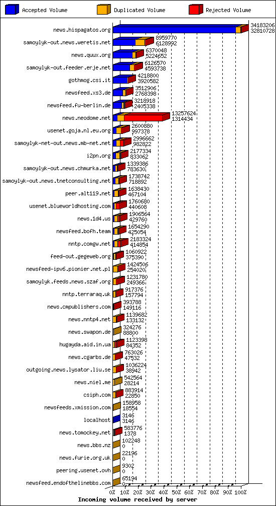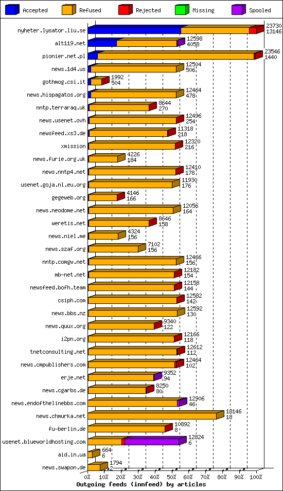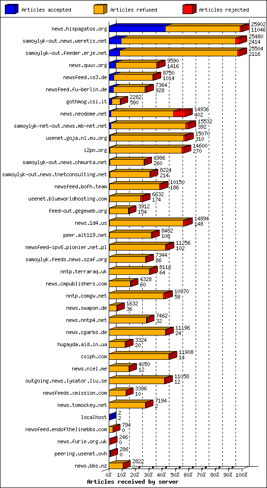 | 15 | usenet.blueworldhosting.com | 250 | 6632 | 174 | 6010 | 448 | 2% | 24:08:18 |