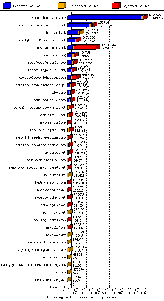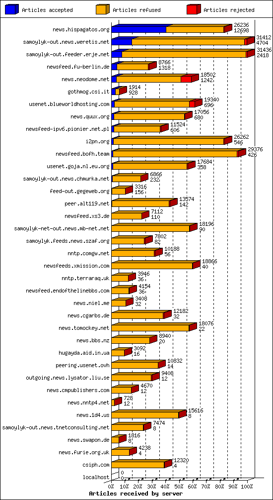 | 19 | nntp.comgw.net | 2 | 10188 | 56 | 9910 | 222 | 0% | 28:07:48 |