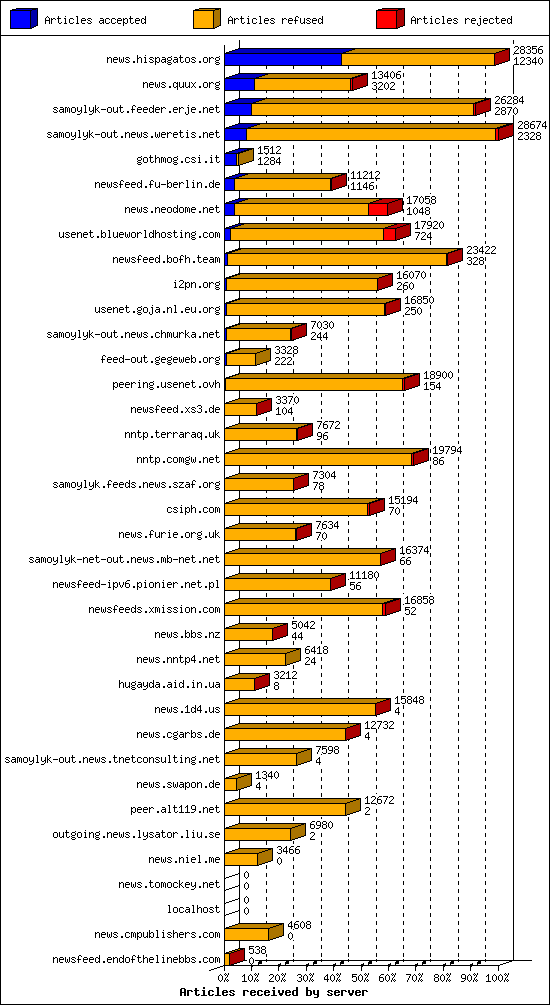 | 11 | usenet.goja.nl.eu.org | 24 | 16850 | 250 | 16586 | 14 | 1% | 48:05:20 |
