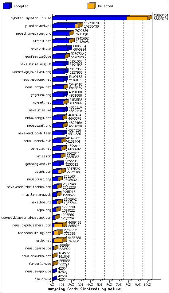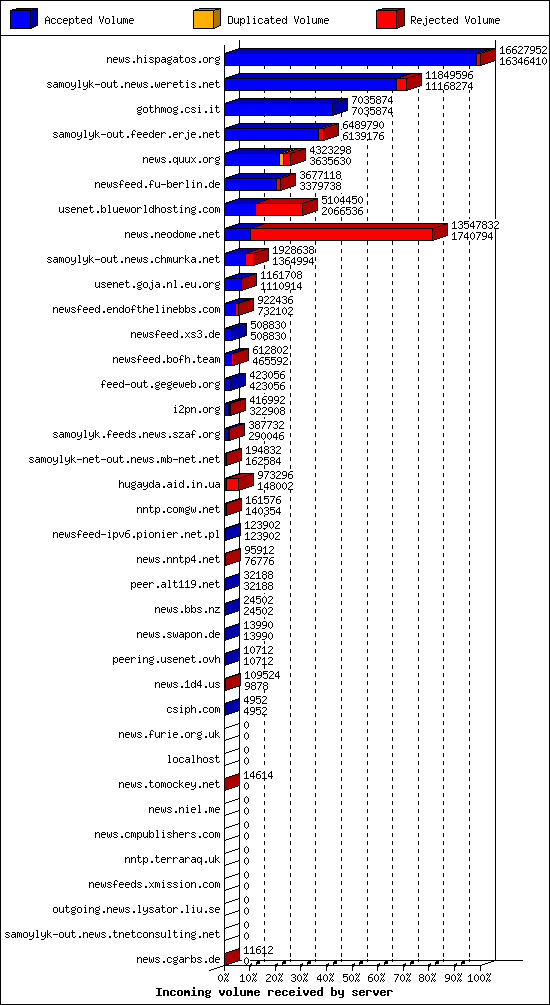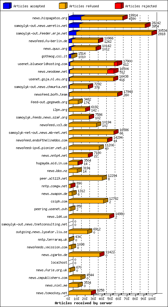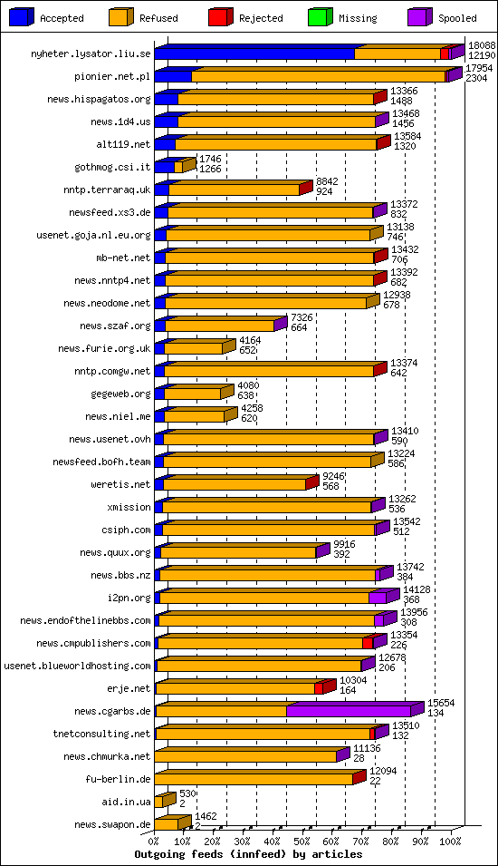 | 9 | usenet.goja.nl.eu.org | 22 | 16438 | 416 | 16006 | 16 | 2% | 49:12:22 |