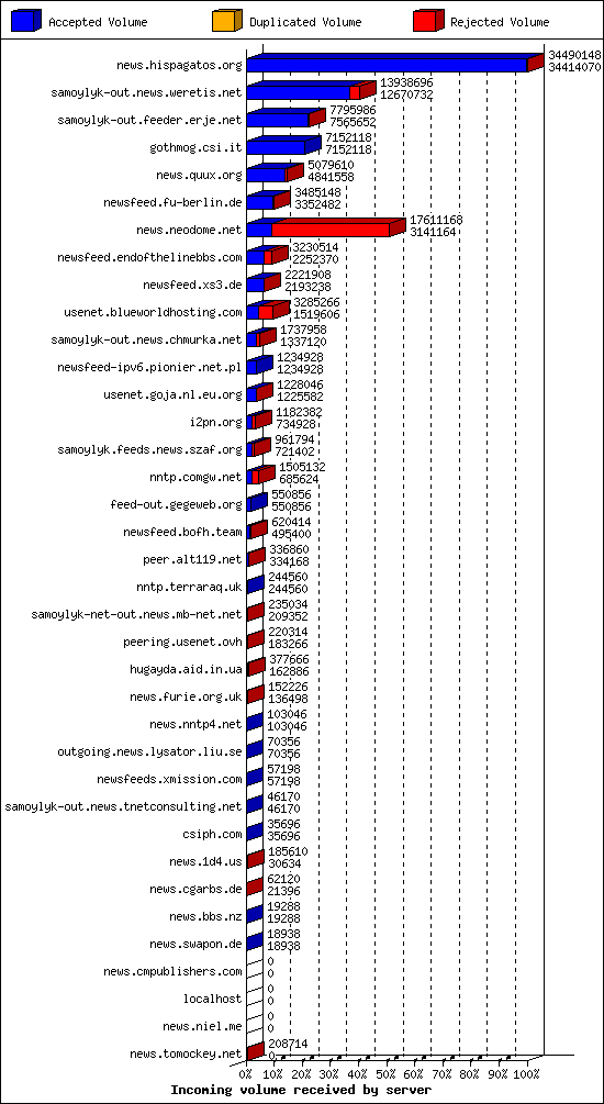 | 9 | usenet.goja.nl.eu.org | 22 | 18468 | 436 | 18030 | 2 | 2% | 48:04:02 |