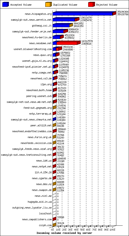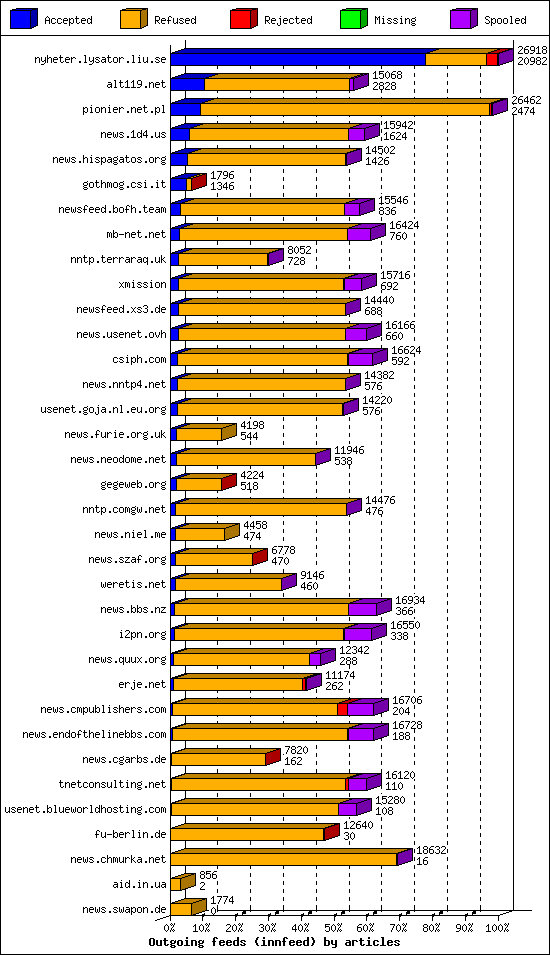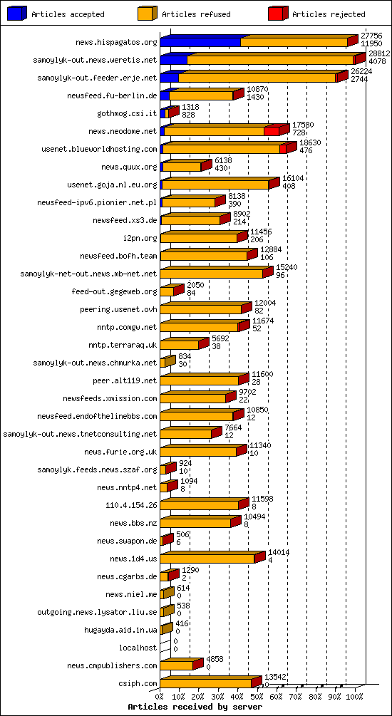 | 17 | nntp.comgw.net | 4 | 11674 | 52 | 11456 | 166 | 0% | 35:00:00 |