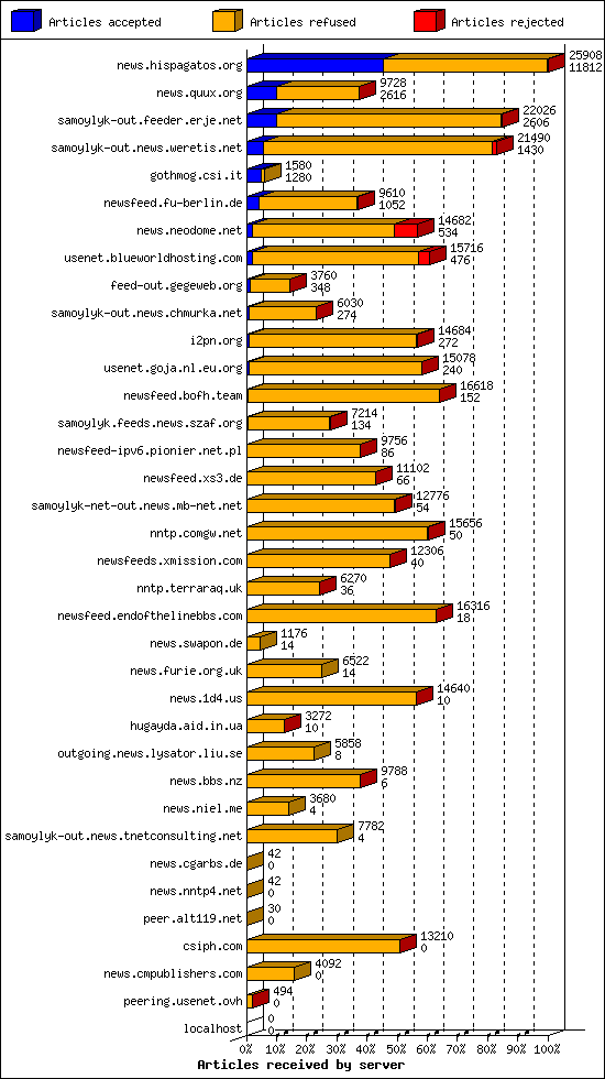 | 12 | usenet.goja.nl.eu.org | 22 | 15078 | 240 | 14826 | 12 | 1% | 48:13:50 |