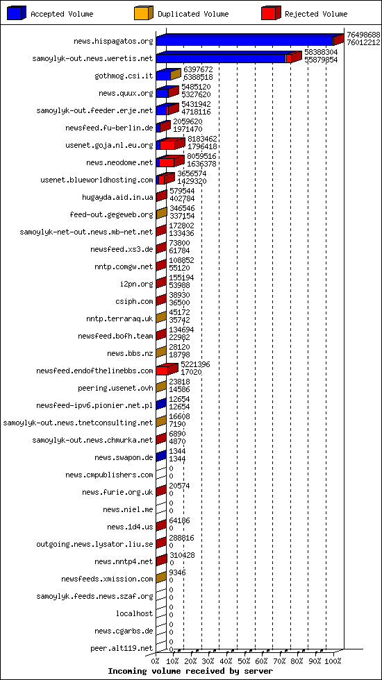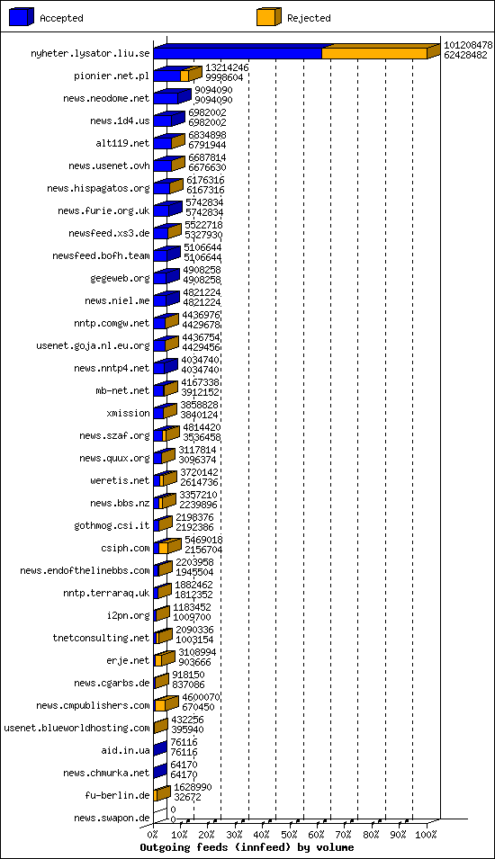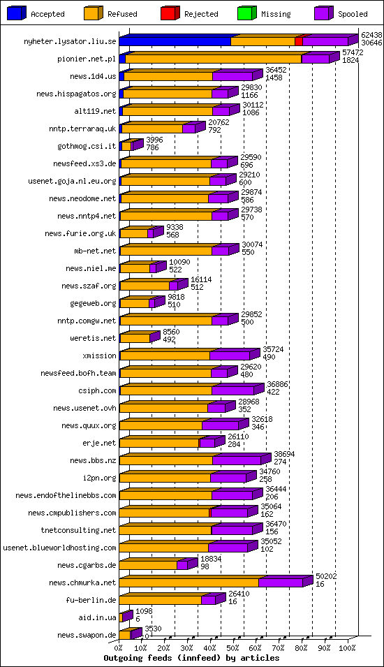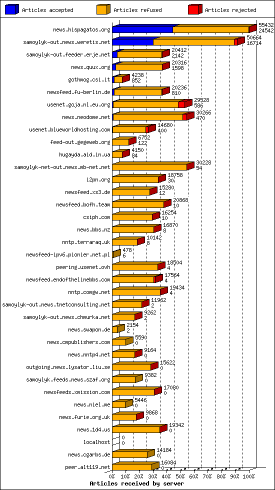| 7 | usenet.goja.nl.eu.org | 20 | 29528 | 586 | 26310 | 2632 | 1% | 36:05:42 |