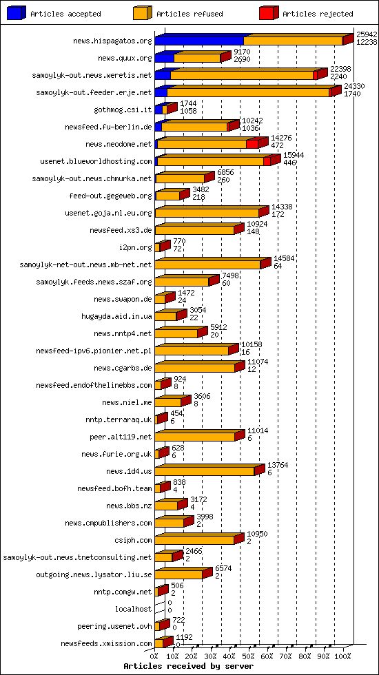 | 11 | usenet.goja.nl.eu.org | 20 | 14338 | 172 | 14126 | 40 | 1% | 45:43:40 |