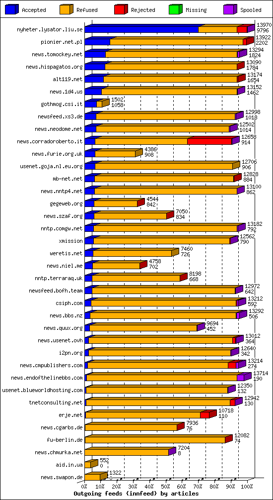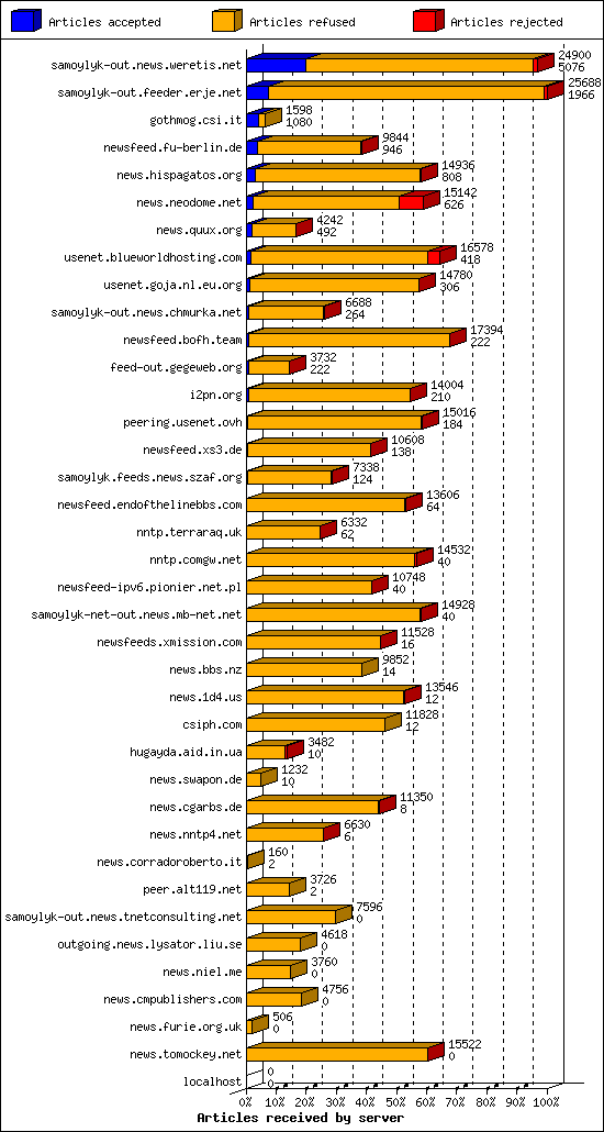 | 9 | usenet.goja.nl.eu.org | 20 | 14780 | 306 | 14462 | 12 | 2% | 48:06:42 |