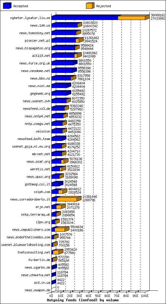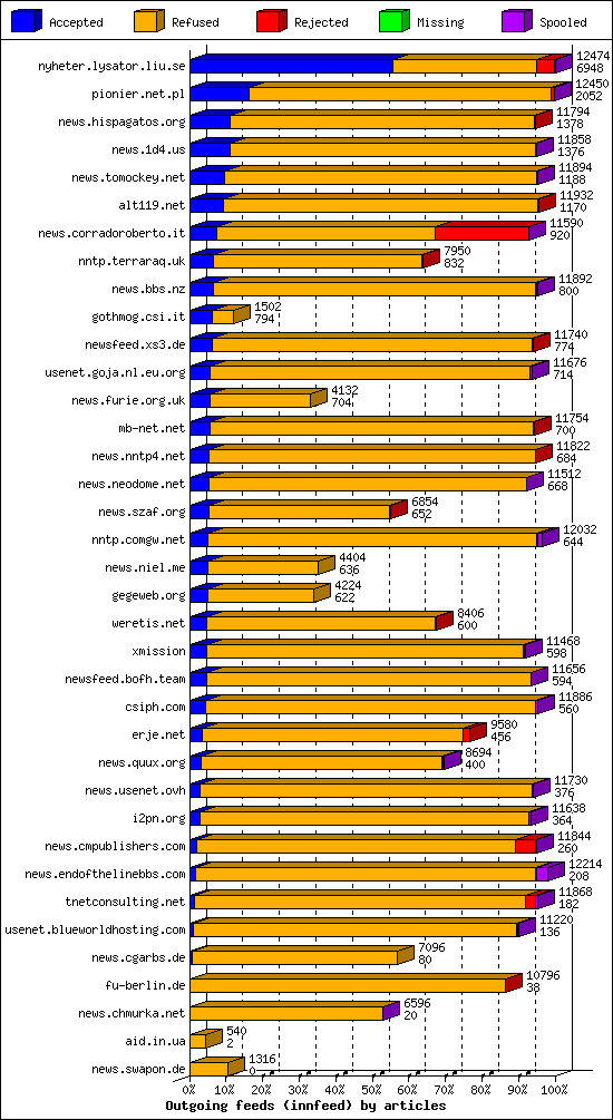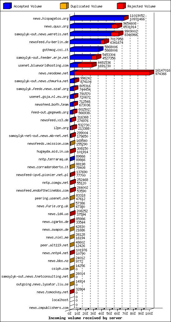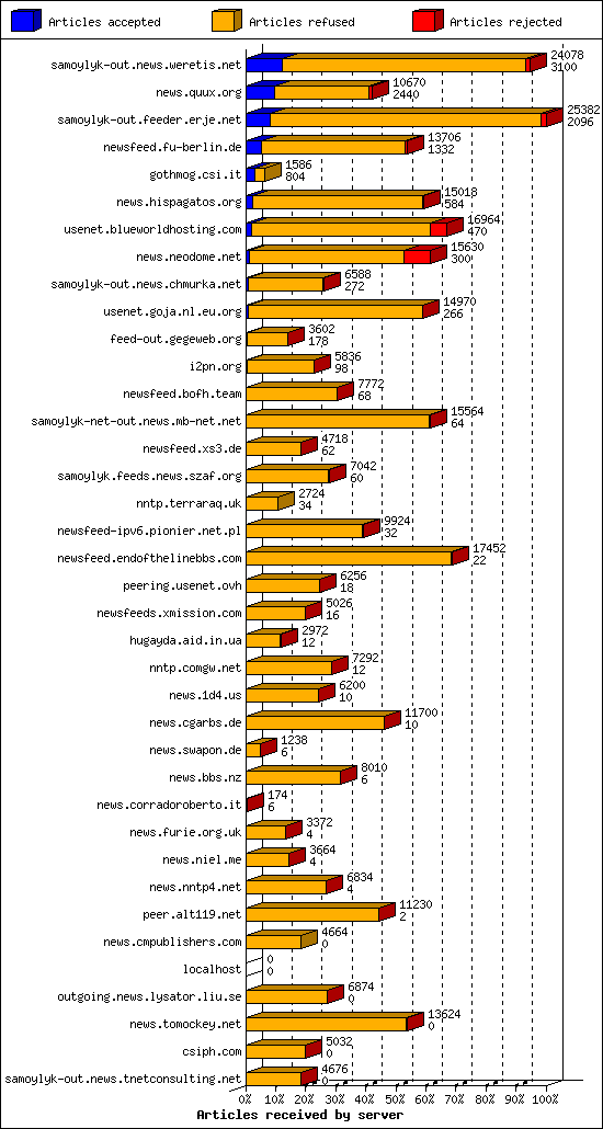 | 10 | usenet.goja.nl.eu.org | 20 | 14970 | 266 | 14676 | 28 | 1% | 46:19:26 |