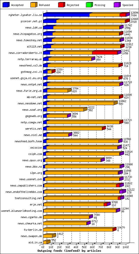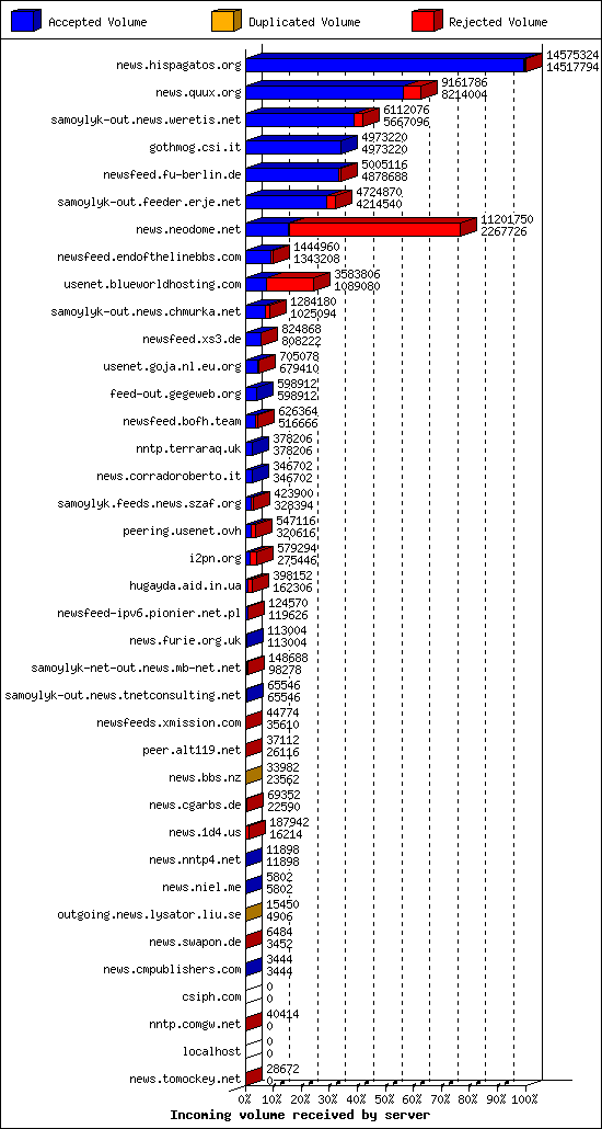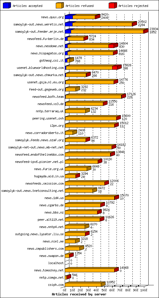 | 10 | usenet.goja.nl.eu.org | 22 | 14776 | 250 | 14514 | 12 | 1% | 48:29:40 |