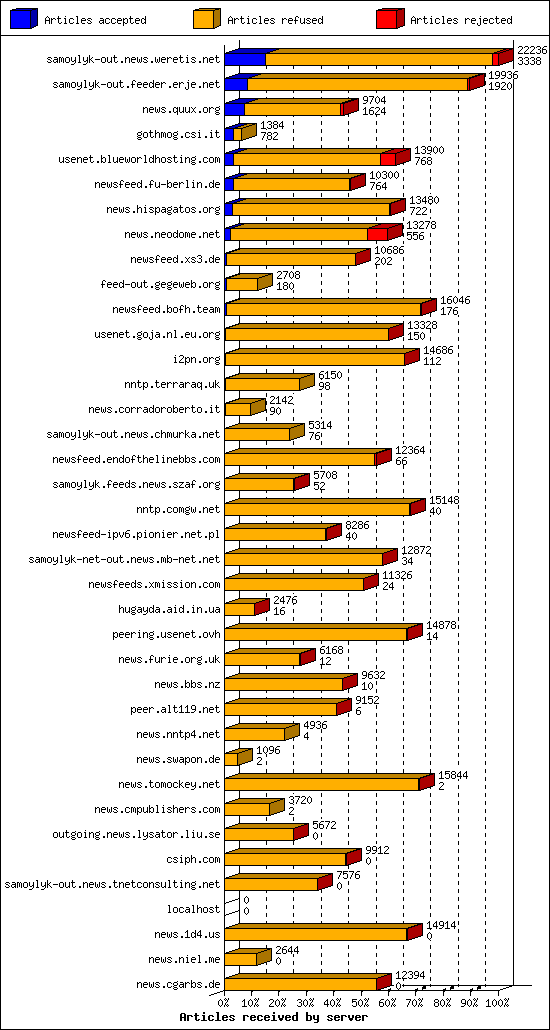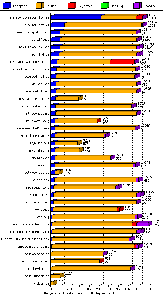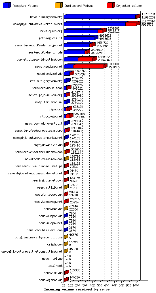 | 12 | usenet.goja.nl.eu.org | 24 | 13328 | 150 | 13172 | 6 | 1% | 47:50:56 |