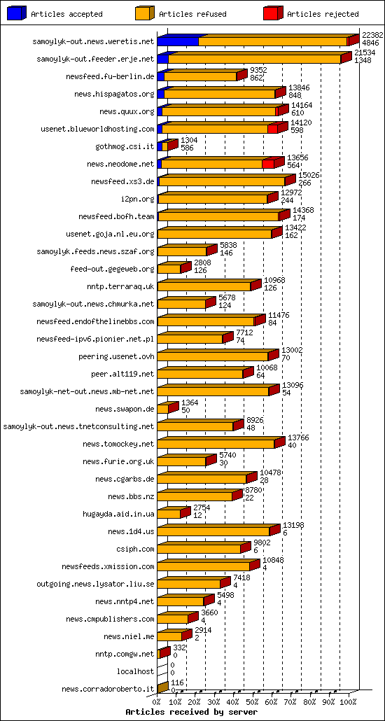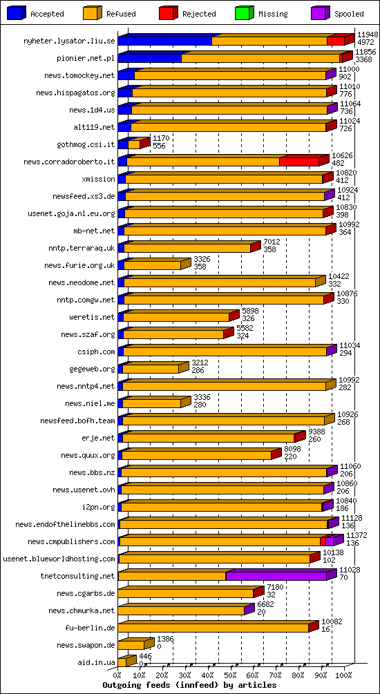 | 12 | usenet.goja.nl.eu.org | 20 | 13422 | 162 | 13210 | 50 | 1% | 47:35:42 |