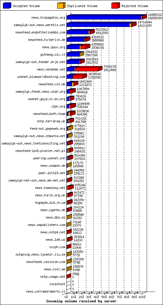 | 6 | usenet.blueworldhosting.com | 1434 | 14120 | 598 | 12318 | 1204 | 4% | 47:33:02 |