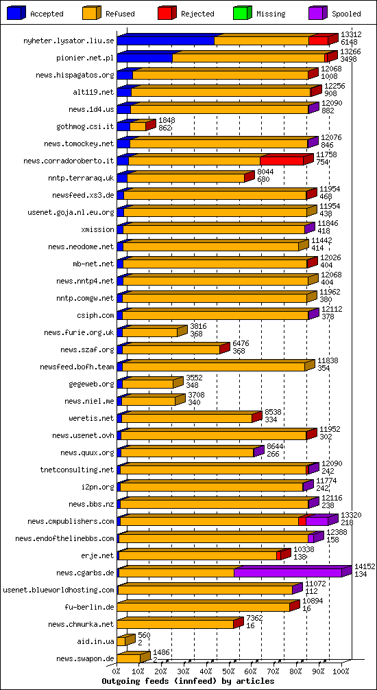 | 19 | newsfeed-ipv6.pionier.net.pl | 6 | 8724 | 38 | 8682 | 4 | 0% | 48:18:20 |