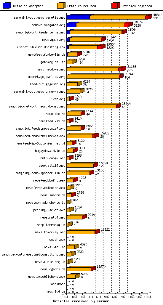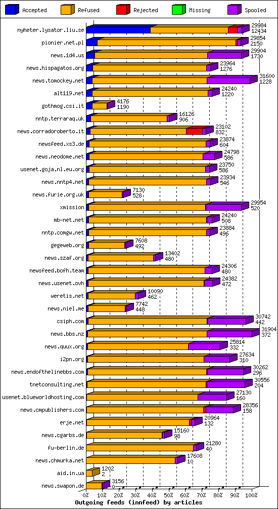 | 22 | outgoing.news.lysator.liu.se | 6 | 13166 | 10 | 13152 | 4 | 0% | 15:54:48 |