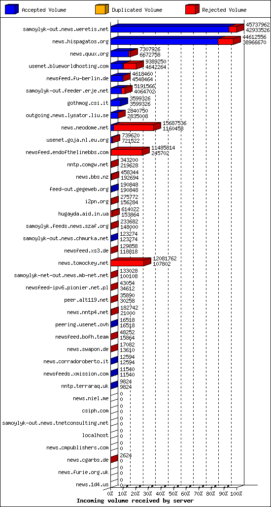 | 9 | usenet.goja.nl.eu.org | 24 | 29744 | 184 | 29546 | 14 | 0% | 48:04:36 |