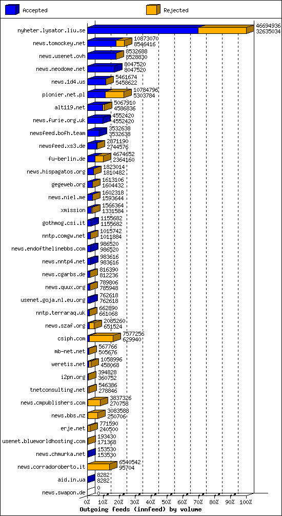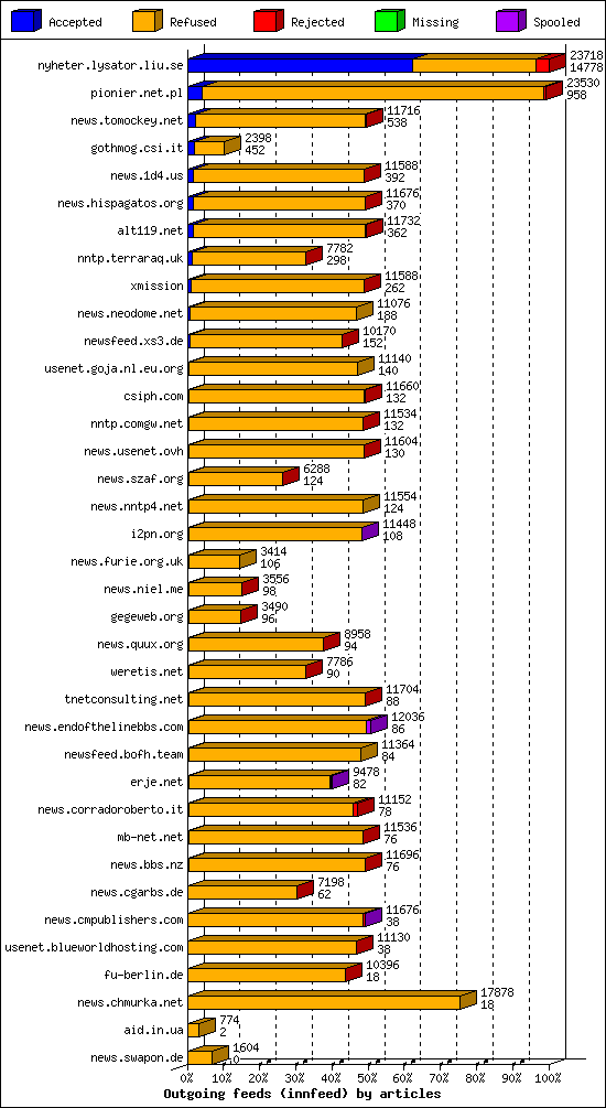 | 14 | outgoing.news.lysator.liu.se | 2 | 10056 | 196 | 9470 | 390 | 1% | 47:59:54 |